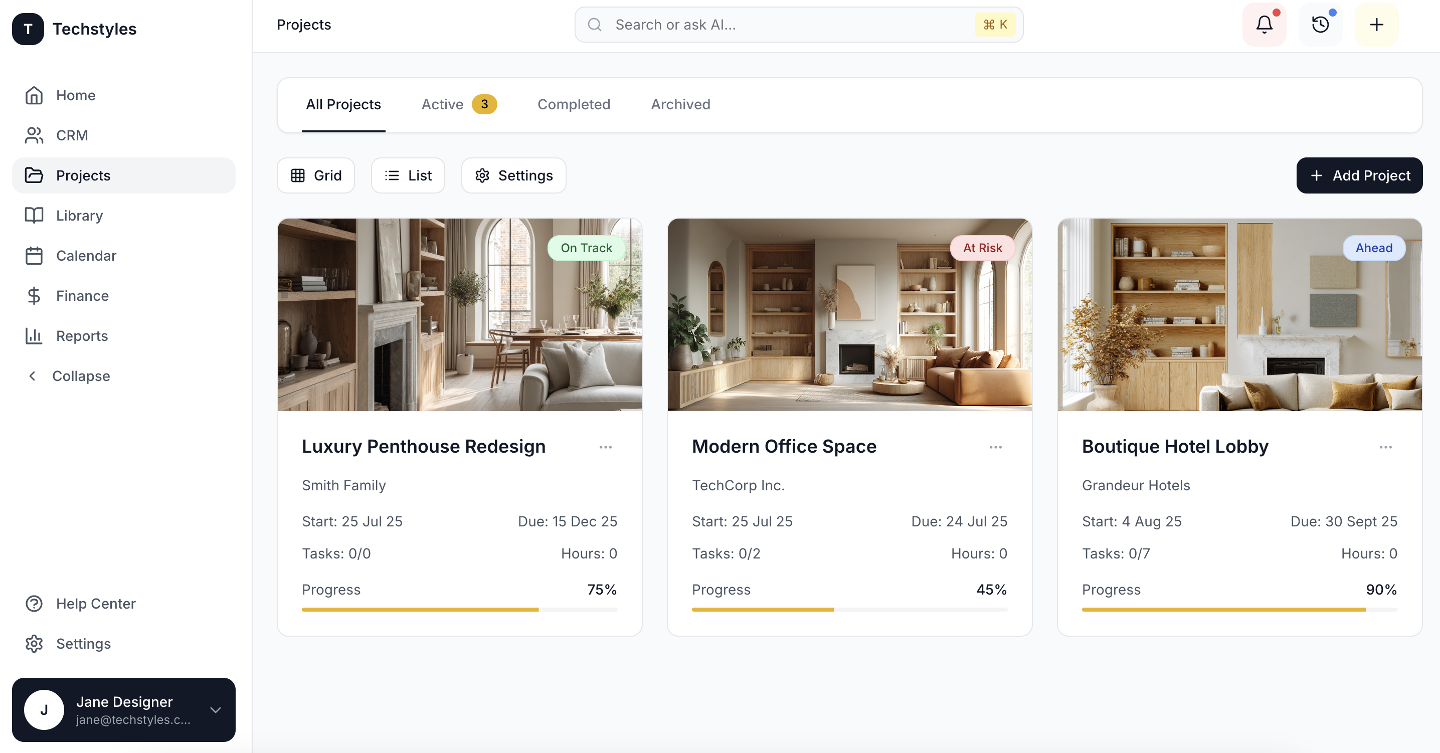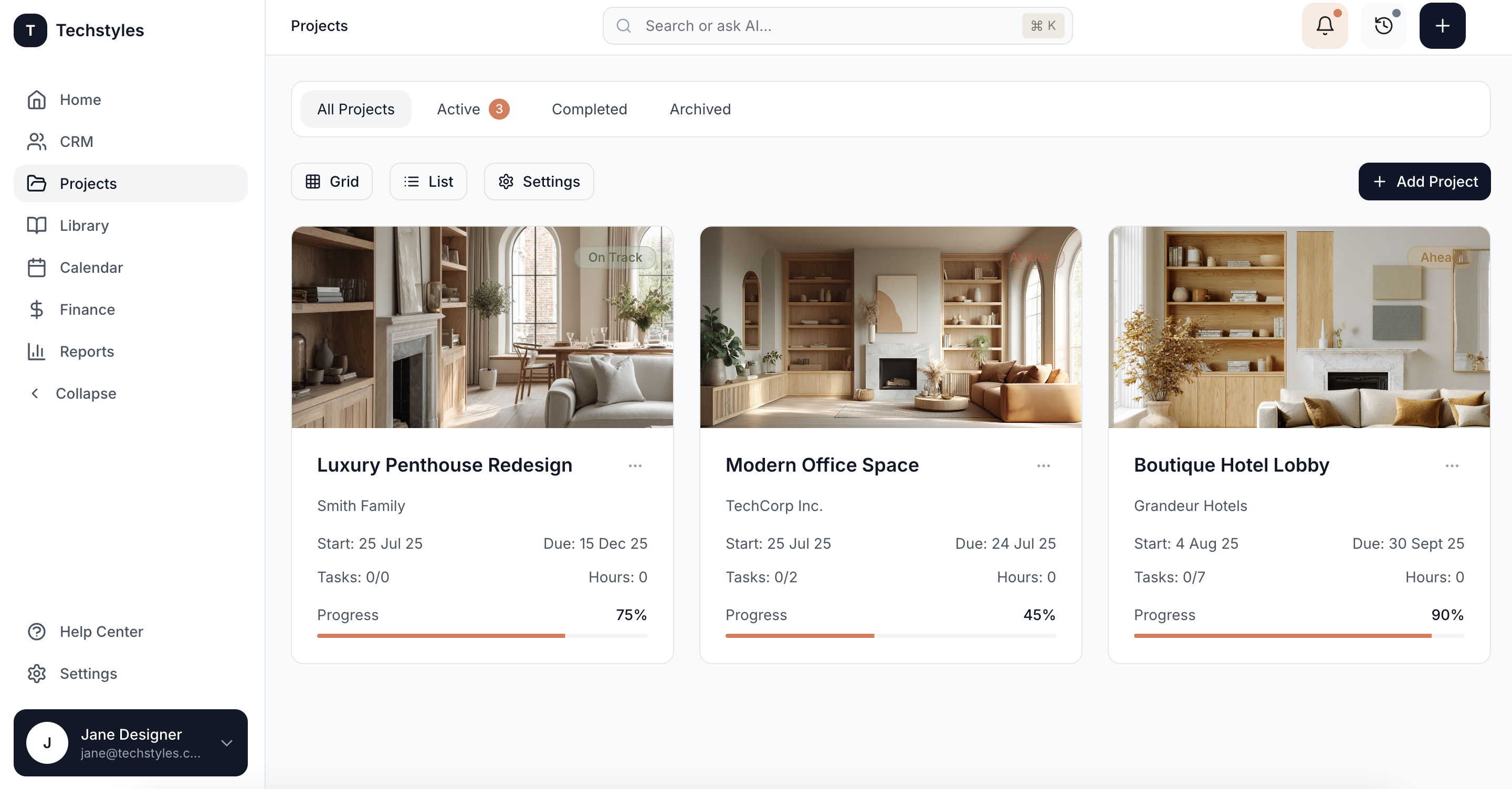 Move beyond standard project tools. Techstyles is the first interior design platform with an intelligent AI layer that automates admin, anticipates needs, and frees you up to focus on creative work.